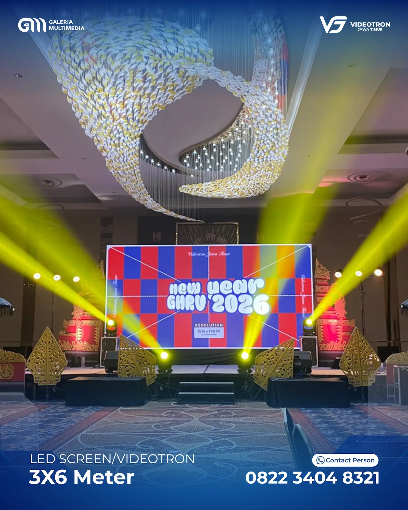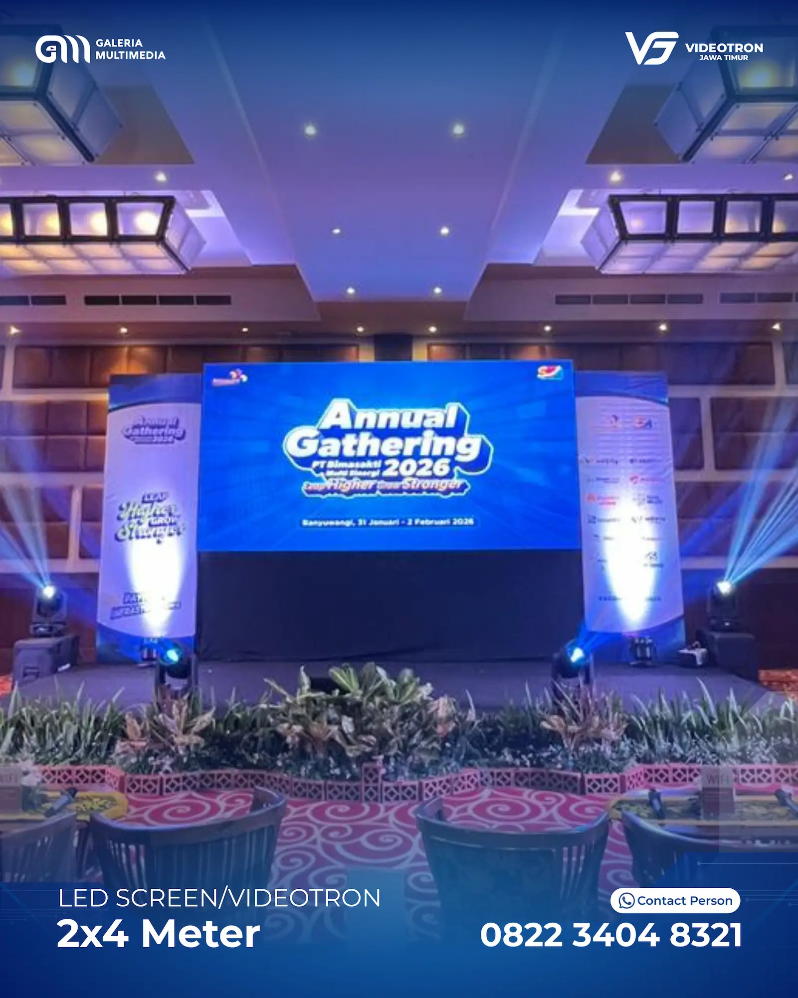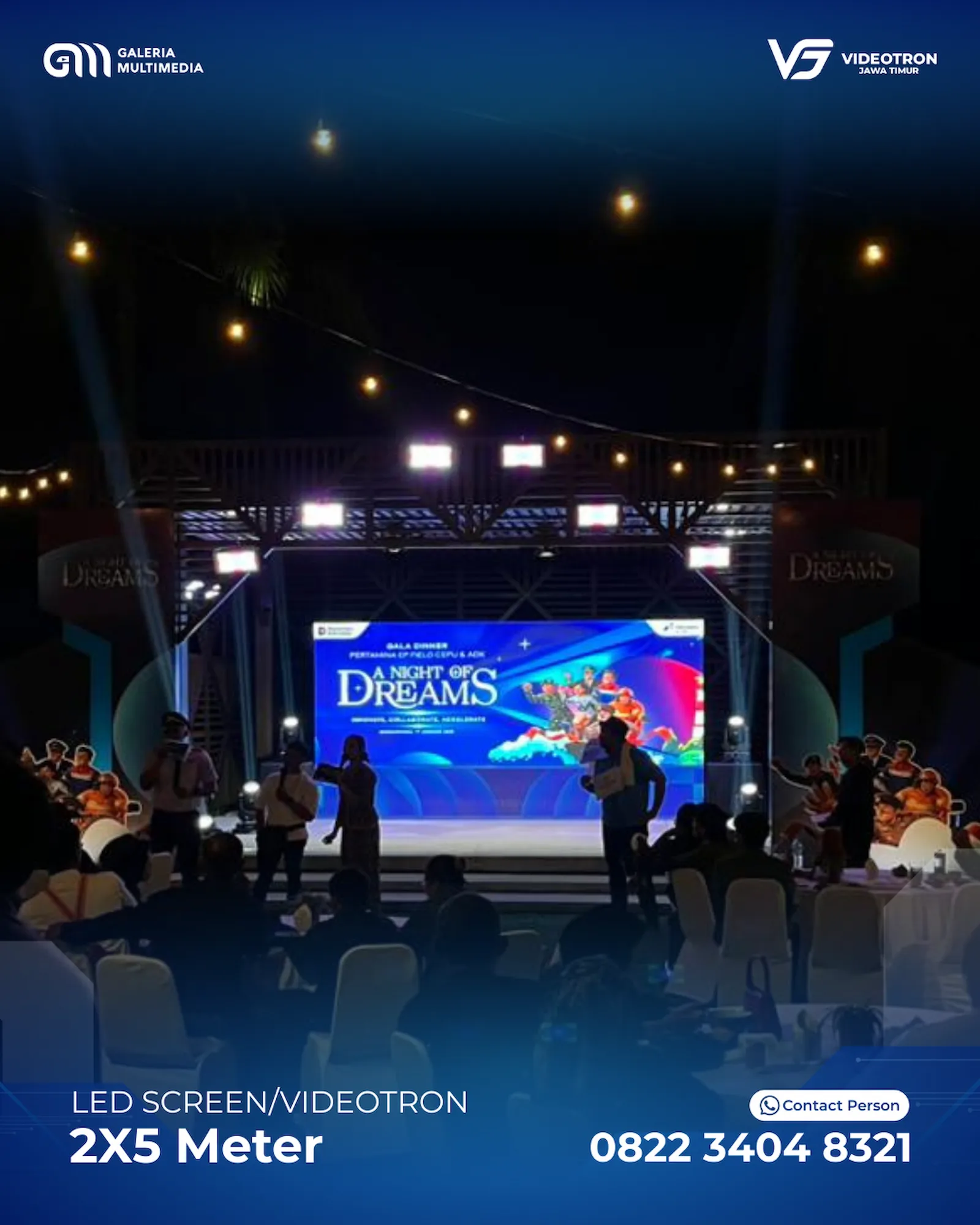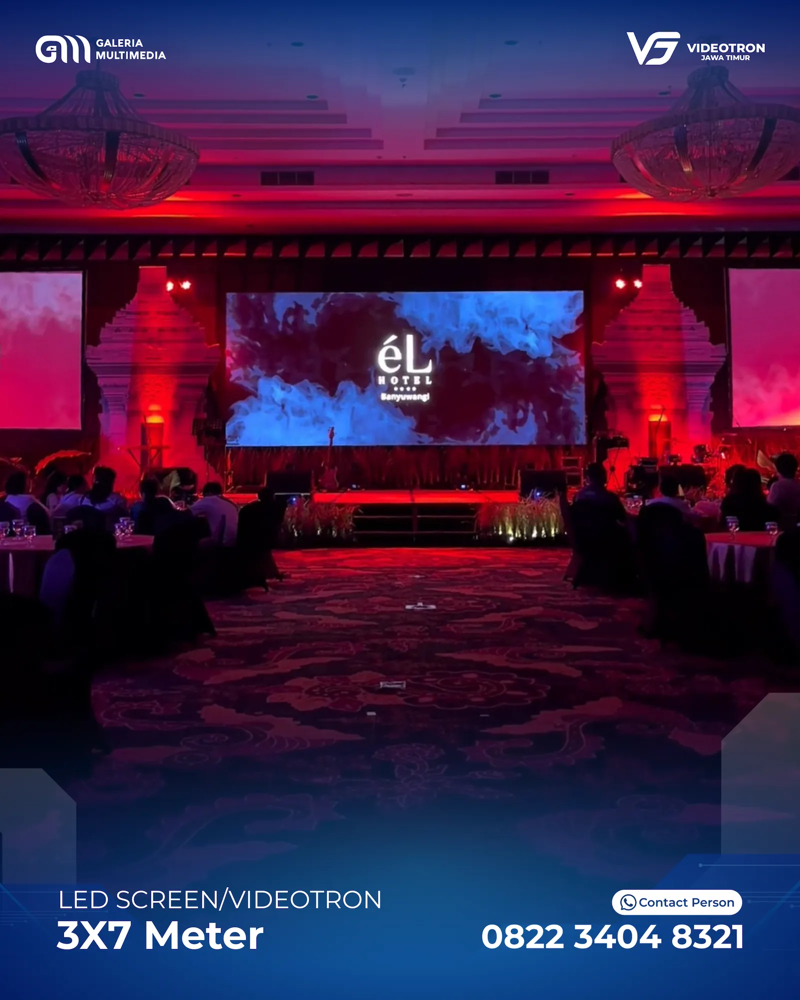 Dengan berbagai pilihan ukuran dan layout Videotron, sehingga memberikan anda kebebasan untuk menyesuaikan dengan acara. Mulai dari standing videotron di tengah panggung hingga hanging videotron di bagian kanan dan kiri panggung utama
